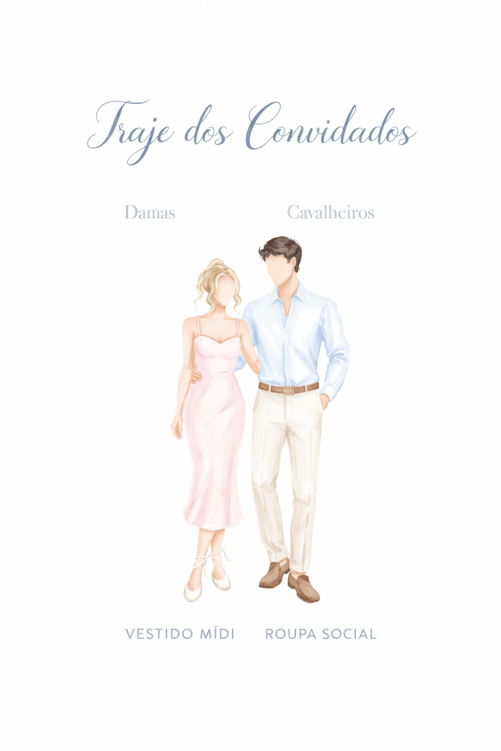 Sugerimos vestidos mídi ou longos para as mulheres e traje social para os homens (não sendo necessário terno completo).